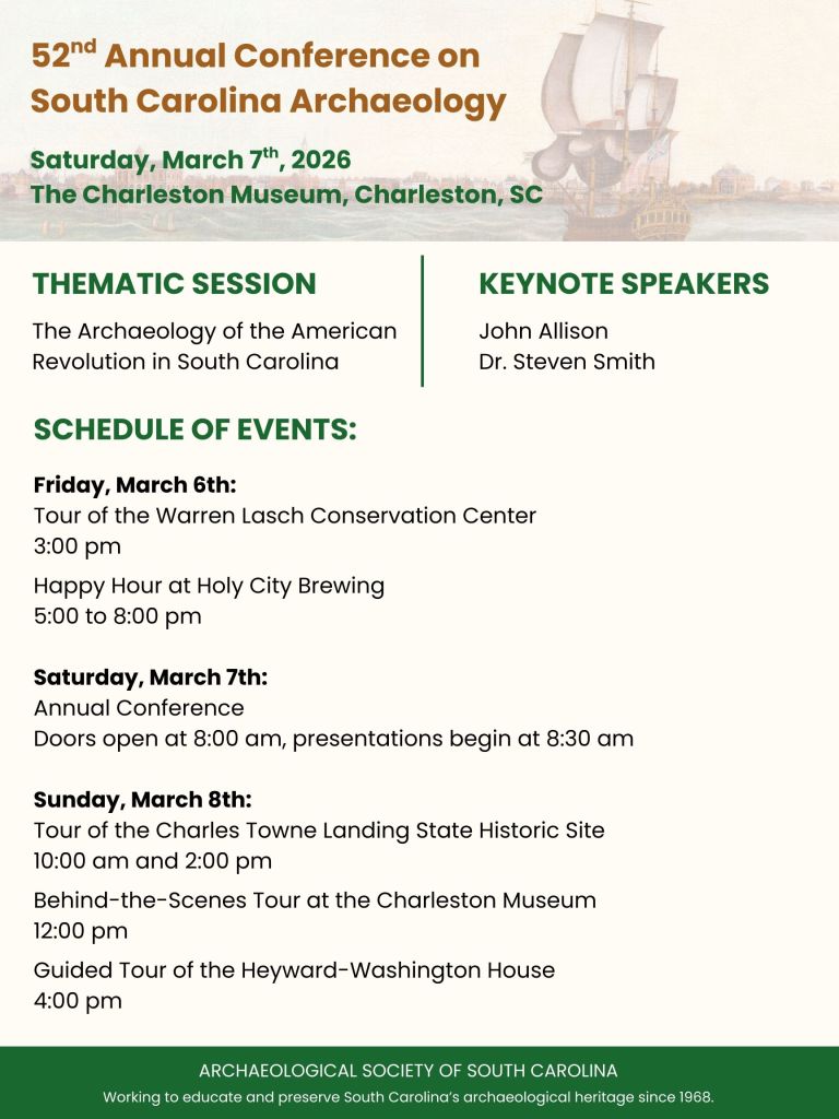 The Archaeological Society of South Carolina (ASSC) will host the 52nd Annual Conference on South Carolina Archaeology on March 7th, 2026 at the Charleston Museum in downtown Charleston, South Carolina. The conference will be held from 8 am to 5 pm and will include a thematic paper session, as well as general paper and poster sessions.
