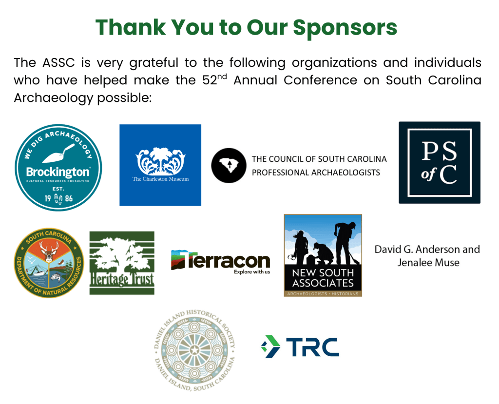 Support the ASSC by purchasing a sponsorship for this year’s 52nd Annual Conference on South Carolina Archaeology. Sponsorships are available at the following tiers: