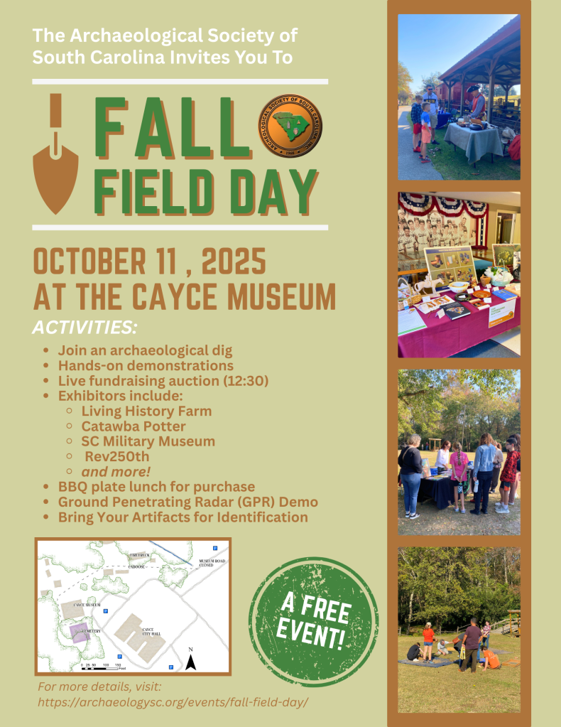 Each fall, the Archaeological Society of South Carolina hosts a free public field day featuring archaeological and historical demonstrations. Join us on October 11, 2025 to learn about how the people of South Carolina’s distant and recent past experienced their daily lives through work, play, food, and community.